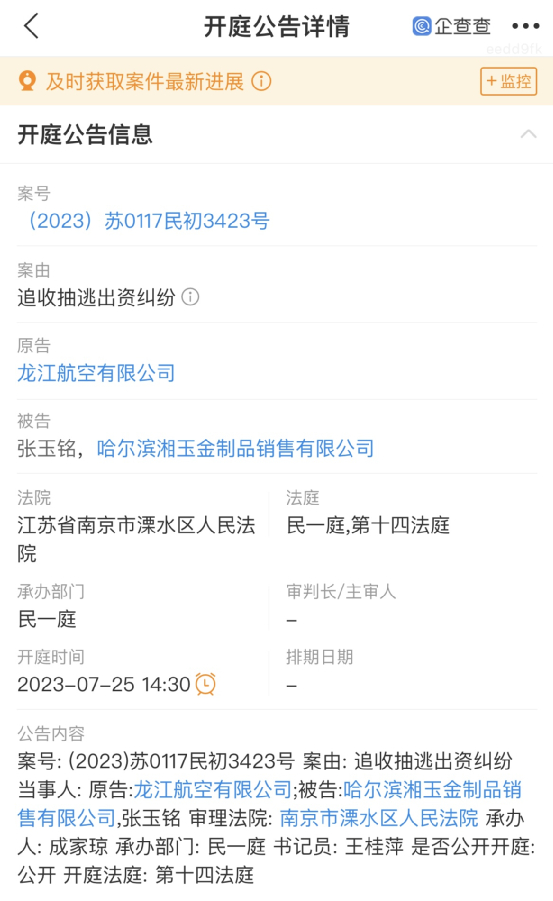 最终,金东投资将龙江航空告到哈尔滨中院。