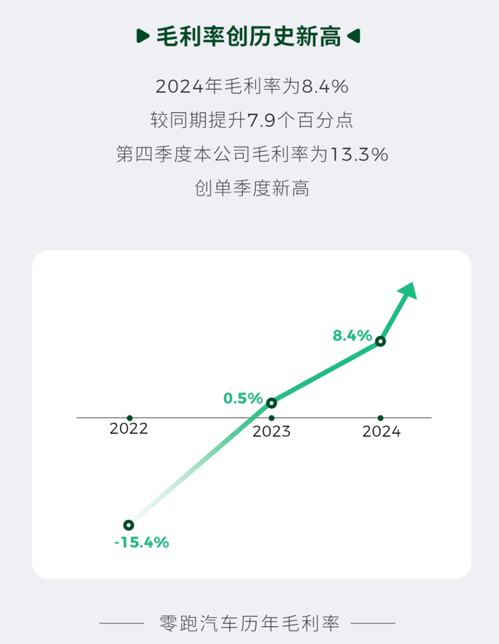 其2024年的财报数据显示,零跑汽车的毛利率实现了从0.5%到8.4%的跃迁,逐步印证成本控制下的成果。