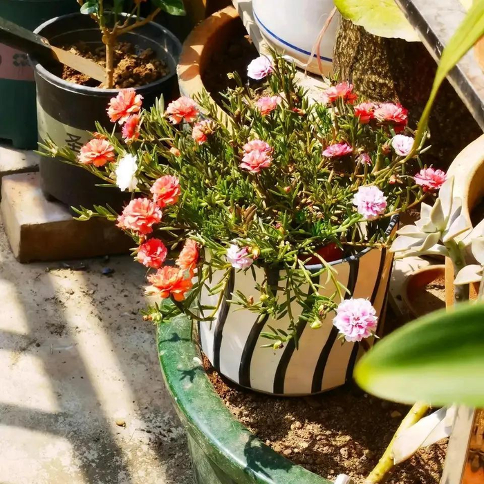 太阳花的茎叶肥厚饱满,储水能力强,除了喜欢光照之外,更需要少浇水,不用怎么管它,也能长得很旺盛。但由于太阳花的枝条会越长越长,时间久了,也会木质化,会导致开花较少,所以对于较长较老的枝条可以剪短,让它重新发芽,侧颜长的越多,开花越多。