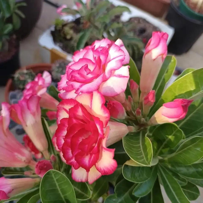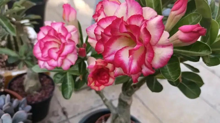 沙漠玫瑰也叫天宝花,原产于非洲肯尼亚,它有一个非常可爱的外表,枝干特别粗大肥壮,花朵开在枝条的顶端,优雅大方,特别好看,把它放在台面上,桌面上,显得妩媚动人,温馨浪漫。