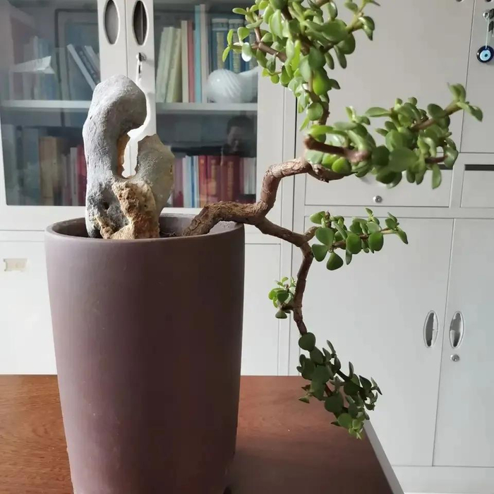 金枝玉叶也叫马齿苋树,它的叶片呈倒卵形,小巧精致,四季常青,枝条的表皮是紫红色的,变成老桩之后会变成红铜色,古香古色,很有年代的沧桑感,特别漂亮。
