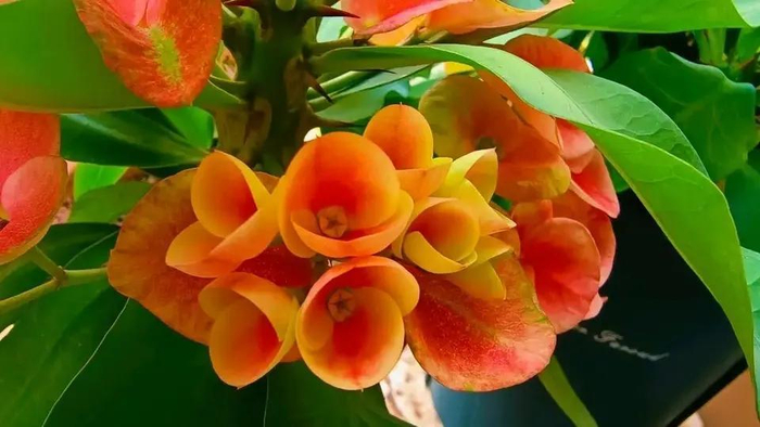 虎刺梅也叫铁海棠,它的名字听起来威武霸气,枝条上布满了尖锐的小刺,花朵确实多姿多彩,有很多颜色,比如红色,粉色,黄色,橙色,精致可爱,搭配青翠的叶片,清丽脱俗,又别具一格。