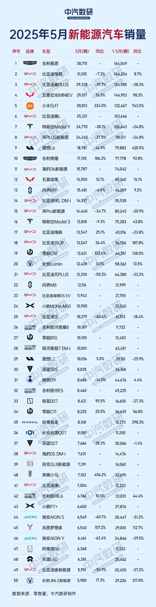 吉利星愿从车型分布看,5月共有29款新能源车型月销量突破万辆,其中8款车型销量超2万辆。在销量前二十车型中,比亚迪占据9个席位,合计销量18.1万辆,占据新能源市场总销量的14%份额。据智车派了解,有机构汇总了5月新能源车销量TOP50,具体排名可以查看长图。