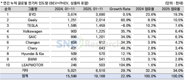 【智车派新闻】据智车派了解,市场研究机构SNE Research发布了2025年1月至11月全球电动汽车(含插电式混合动力车)的销售数据——交付量达到约1916.8万辆,较去年同期增长约22.9%。