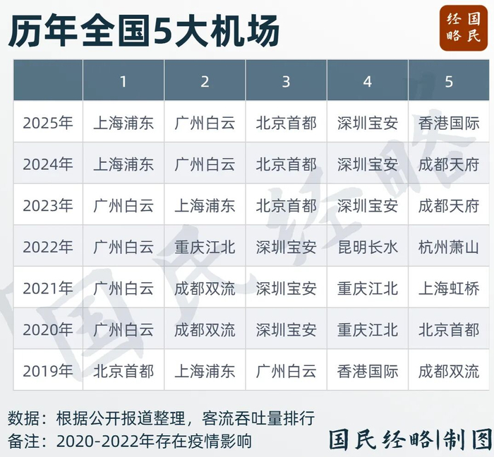 上海浦东、广州白云、北京首都、深圳宝安、香港国际机场位列前五。