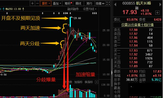 3、该走加速却不符合走加速的条件,其实上述第2条也属于这个情况,但这里要说的是集合竞价符合预期,但是盘中却爆量,或者涨停时间比前一日晚很多,这些都属于显弱的情况,