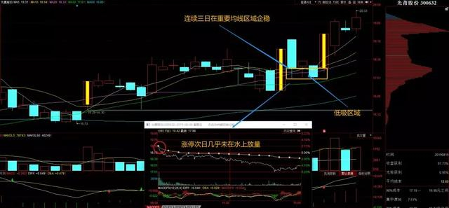 但是次日在大盘的影响下直接下杀,水上几乎没有放量,全天一路低走,这个时候就可以断定封板资金被套,在尾盘就可以尝试介入。