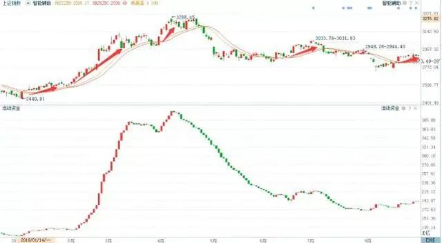 在顶底理论的最后,可以结合股价和资金背离的方法多分析大盘。如图,在第一个绿色框里流动资金在不断流出,但股价却在后半段反弹、震荡,这意味什么呢?在第一个黄色框内,流动资金在不断拉升,而股价却大幅度下跌并震荡,这是机会还是风险呢?
