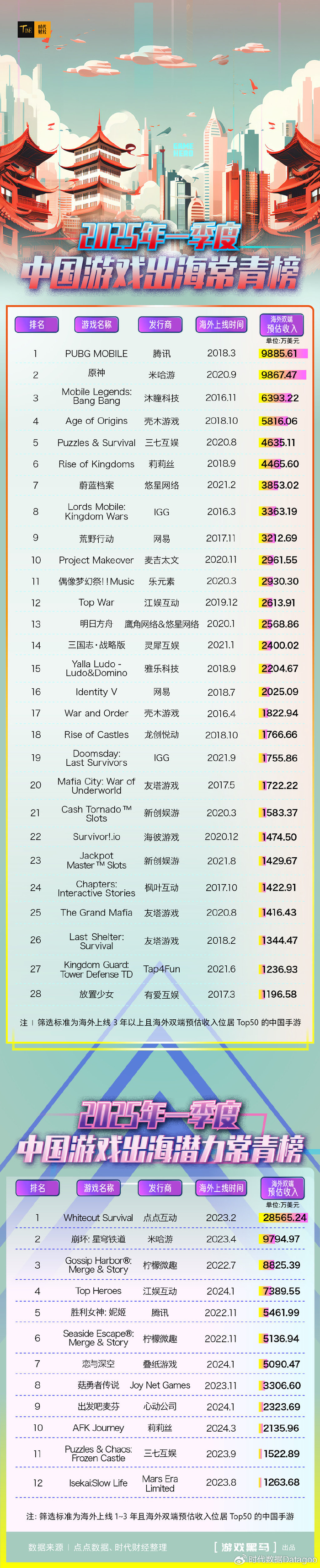 时代财经以海外上线3年以上且海外双端预估收入跻身Top50的中国手游为筛选标准,统计并发布《2025年一季度中国游戏出海常青榜》(下称“《出海常青榜》”);同时以海外上线1年至3年且海外双端预估收入跻身Top50的中国手游为标准,统计并发布《2025年一季度中国游戏出海潜力常青榜》(下称“《出海潜力常青榜》”)。