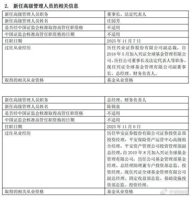 11月7日晚间,兴证全球基金发布高管人事变动公告称,公司原总经理庄园芳升任董事长,原副总经理陈锦泉自11月6日起担任兴证全球基金总经理、财务负责人。