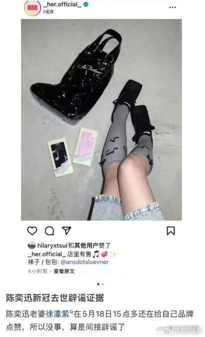 不仅是爱徒发文辟谣,陈奕迅的妻子徐濠萦前一天还发文宣传自己的品牌,并点赞了这条博文,这也间接证明了陈奕迅没事,所谓去世纯属谣言。