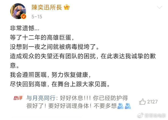 在5月15日,陈奕迅方面通过社交平台宣布,因为得了新冠,不得不取消等了12年的高雄巨蛋演唱会,在表达遗憾的同时,也会努力恢复健康,尽快和大家见面。