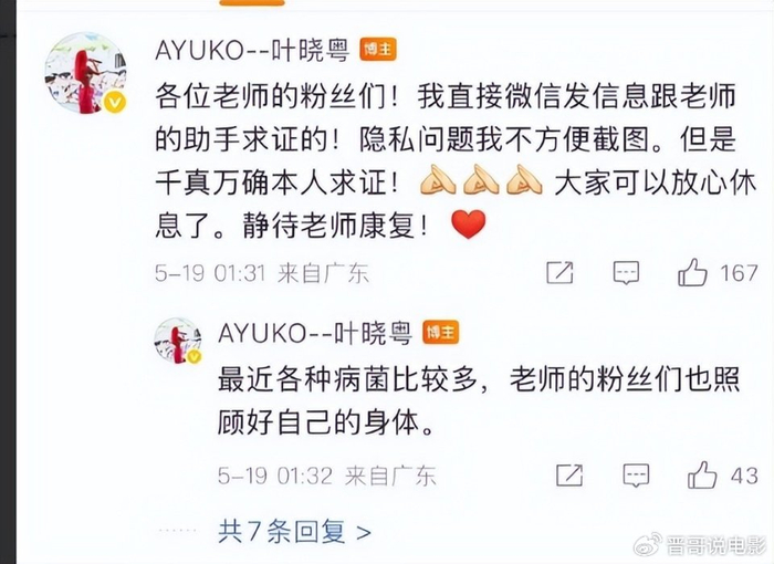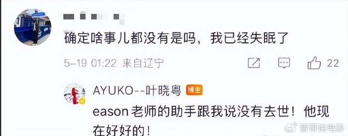 评论区有网友留言,自己因为担心已经失眠了,叶晓粤也回复再次确认,陈奕迅现在好好的。