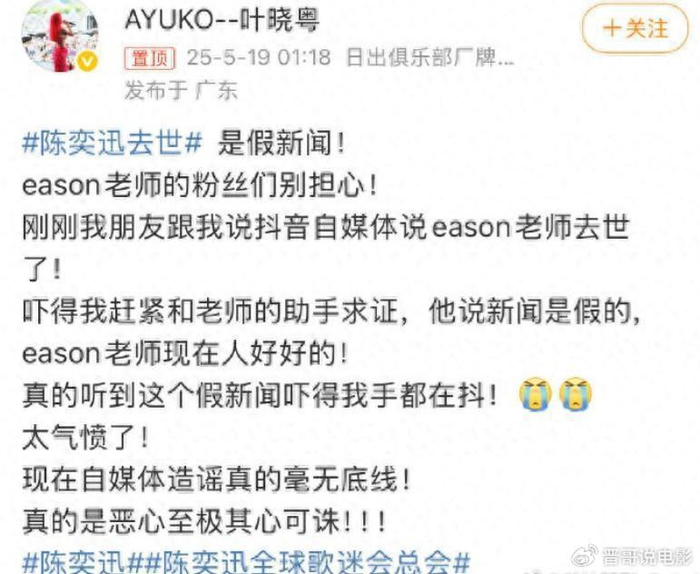 对于陈奕迅的健康状况,不但牵动了许多网友的心,他的好友也非常关注这件事。今天凌晨1点多,陈奕迅的徒弟、歌手叶晓粤发文表示陈奕迅去世是假新闻!