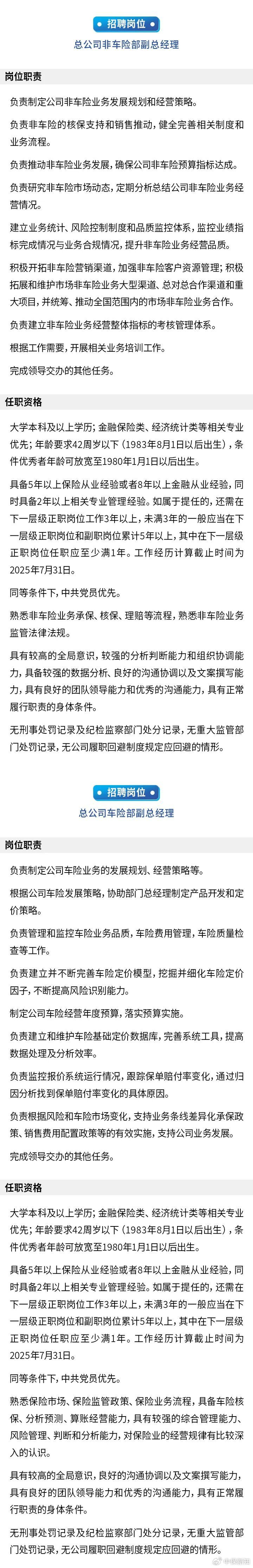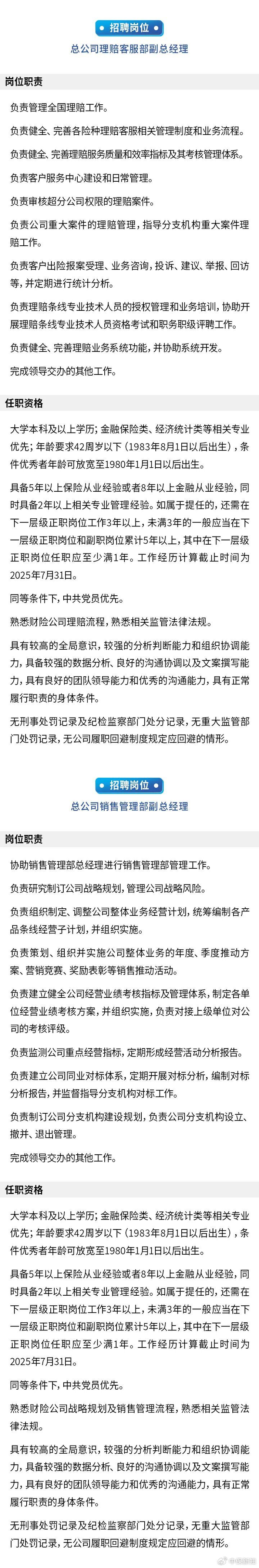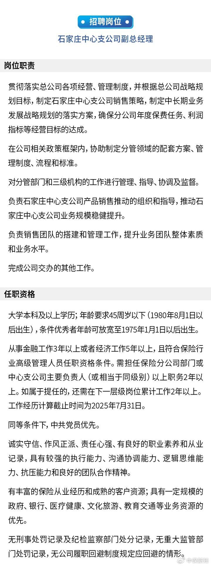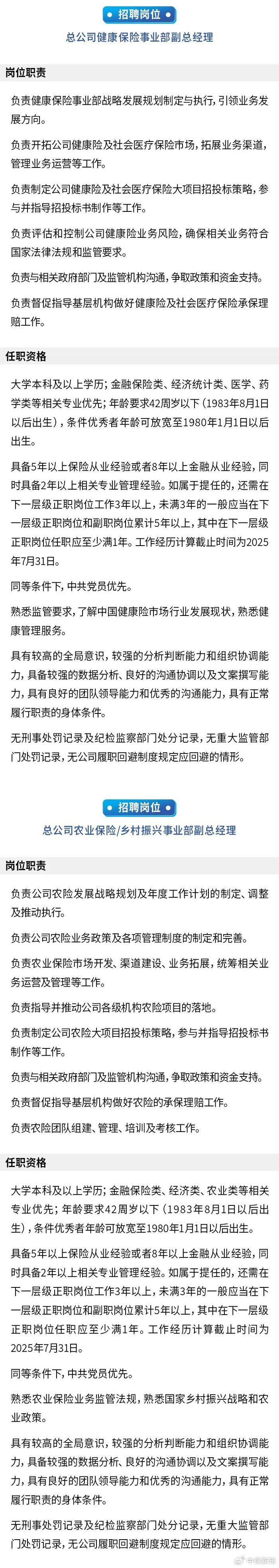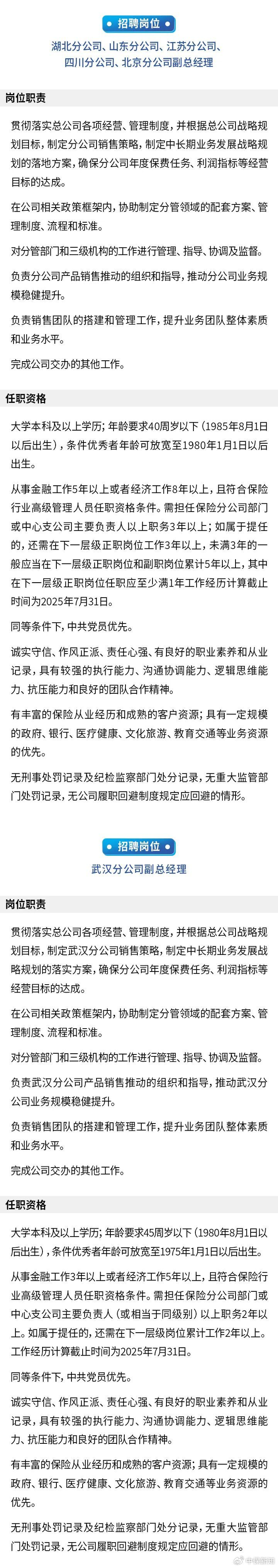 要想稳固组织架构与市场,中层管理人员至关重要,往往发挥着上传下达、承上启下的关键作用。中保新知注意到,9月11日,长江财险在其官网发布了中层副职招聘公告,据悉,此次岗位需求共涉及13个职位,其中总部车险部、非车险部、农业保险/乡村振兴事业部、健康保险事业部、理赔客服部、销售管理部招募副总经理,湖北、山东、四川、江苏、北京、武汉分公司、石家庄中心支公司招聘副总经理。