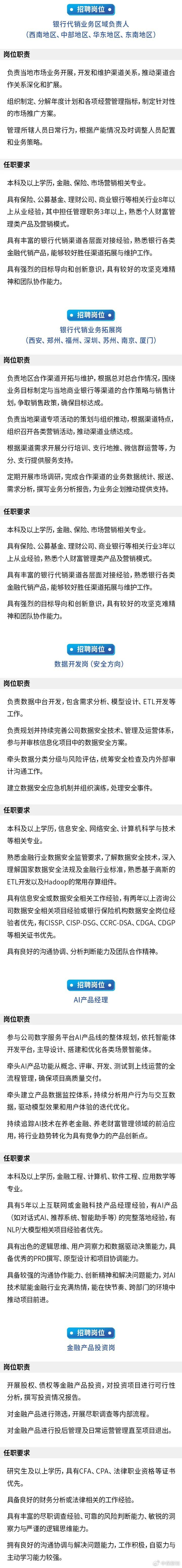 中保新知注意到,11月份以来,国民养老相继在西南、中部、华东、华南四大地区招募银行代销业务区域负责人,在西安、郑州、福州、深圳、苏州、南京、厦门等七大城市招聘银行代销业务拓展岗,此外,总公司还释放了数据开发岗(安全方向)、AI产品经理、金融产品投资岗3个岗位。