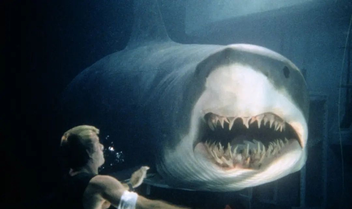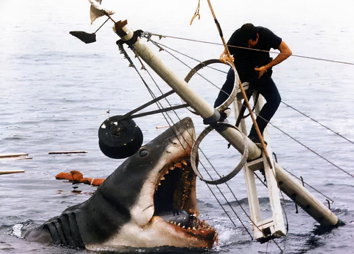 1975年,电影《大白鲨》只利用一只模型鲨鱼把观众吓得如坐针毡。由于受到资金等因素的影响,导演斯皮尔伯格利用封闭水库进行取景拍摄,由工作人员举着鱼鳍在水中制造大白鲨游动的假象。