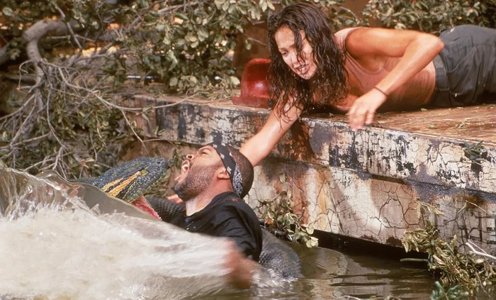 影片中鳄鱼生生咬断男人的手臂,在木桥下发起攻击的场面极具视觉冲击力。结尾男主角用游船螺旋桨炸碎鳄鱼的场景令人触目惊心。
