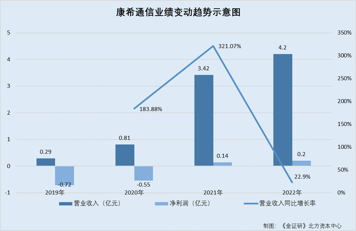 根据《金证研》北方资本中心测算,2020-2022年,康希通信营业收入增速分别为183.88%、321.07%、22.9%,2022年,康希通信净利润增速为49.62%。
