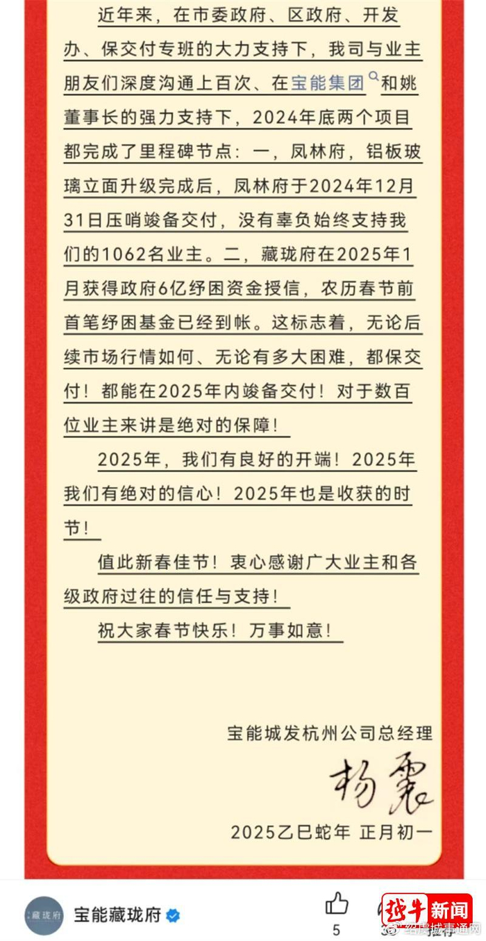 2025年1月29日,宝能城发杭州公司总经理杨震在致宝能业主的公开信中承诺:“无论后续市场行情如何、无论有多大困难,都保交付!都能在2025年内竣备交付!对于数百位业主来讲是绝对的保障!”