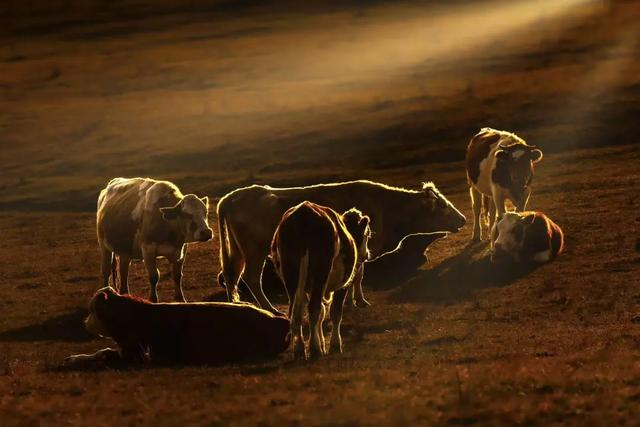 点评:逆光之下,牛的轮廓被勾勒得清晰而优美,毛发仿佛都闪耀着柔和的光泽,质感十足。