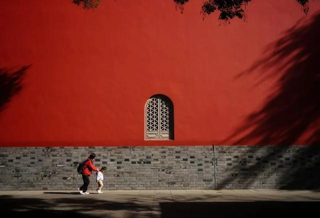 点评:红墙的浓郁色调成为绝对亮点,色彩搭配简洁却富有张力,与灰黑色砖墙形成强烈对比,营造出庄重而典雅的氛围。人物的出现为画面注入生活气息,衣服色彩与背景红墙也非常默契,再加上光影效果增强立体空间感,整体展现出颇具古典韵味和谐之美。