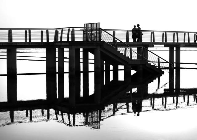 点评:黑白影调营造出极简主义风格,画面具有强烈的视觉抽象感和形式美感。栈桥的立柱与栏杆构成的几何线条,加上人物剪影为画面增添的故事感,整体构图平稳、对称,展现出一种宁静、悠远的意境。