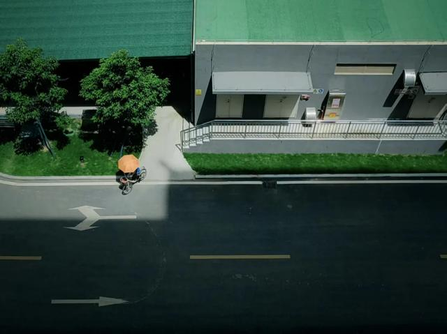 点评:以俯视视角呈现了独特的城市景观,画面色彩搭配和谐,绿色的屋顶与草地、灰色的建筑、黑色的道路相互映衬,加上低饱和度橙色雨伞的点缀,画面布局有一定平衡感。拍摄时机不错,光影效果明显,捕捉了日常生活中的一个瞬间,展现出一种静谧而平凡的美。