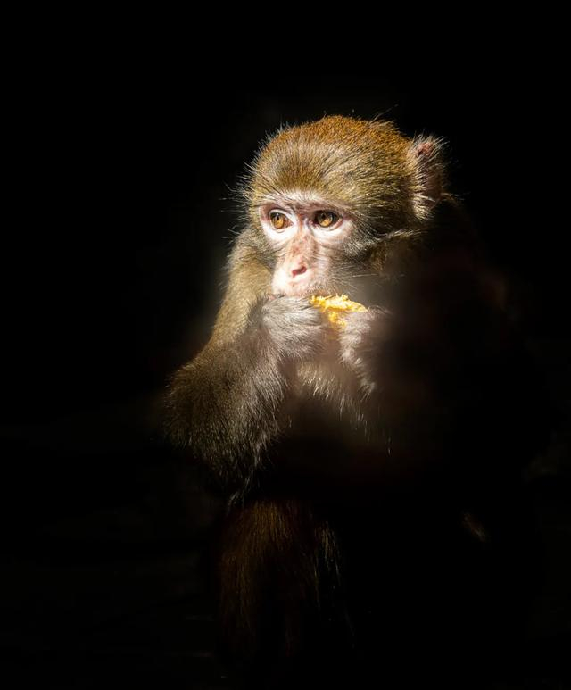 照片的光影运用非常好,光线柔和地打在猴子面部,凸显毛发质感,明暗对比强烈却又和谐统一,赋予画面强烈的艺术感染力。作品以独特的视角和精湛的拍摄技法,展现了动物鲜为人知的一面。