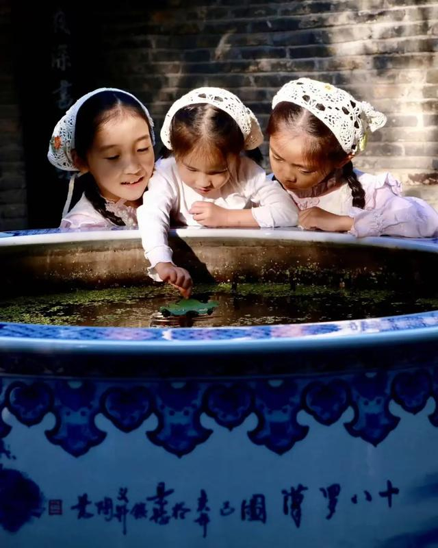 点评:此作品充满纯真与童趣,极具感染力。画面中三个头戴蕾丝头巾的小女孩身着浅色衣物,趴在蓝白相间的大瓷缸边,专注地摆弄水中绿物,神情天真烂漫。