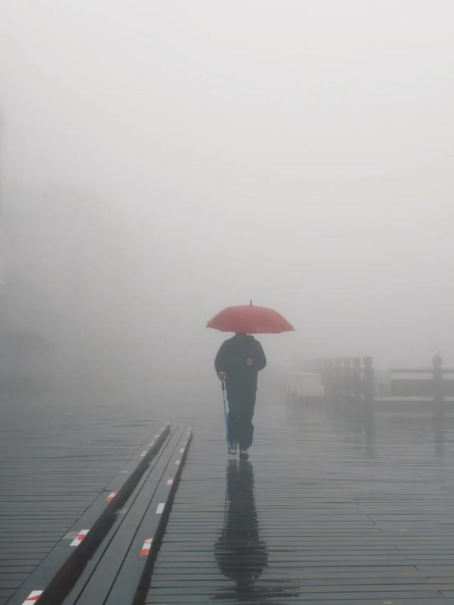 点评:这张作品的氛围感不错,具有一定的意境美。手持红色雨伞的人物站在浓雾弥漫中行走,主体非常明确,红伞在灰暗的背景中格外醒目。整体构图简洁,主体突出,通过极简的元素传达出主体情感。