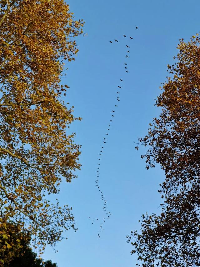点评:画面以仰视视角展开,蔚蓝天空作为纯净背景,衬托出两旁繁茂的树木与空中迁徙的鸟群。鸟群有序排列,呈优美的弧线飞过,为画面增添了动态之美与生机活力。鸟影虽小却清晰可辨,与静穆的树木形成鲜明对比,一动一静,尽显自然韵律。
