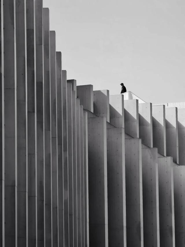 点评:规律的线条和几何形状带来视觉上的秩序感与节奏感。在建筑顶端,渺小的人物身影形成对比,凸显出建筑的宏伟与人类的孤寂,赋予画面意味,引发观者对于人与建筑、空间关系的思考。