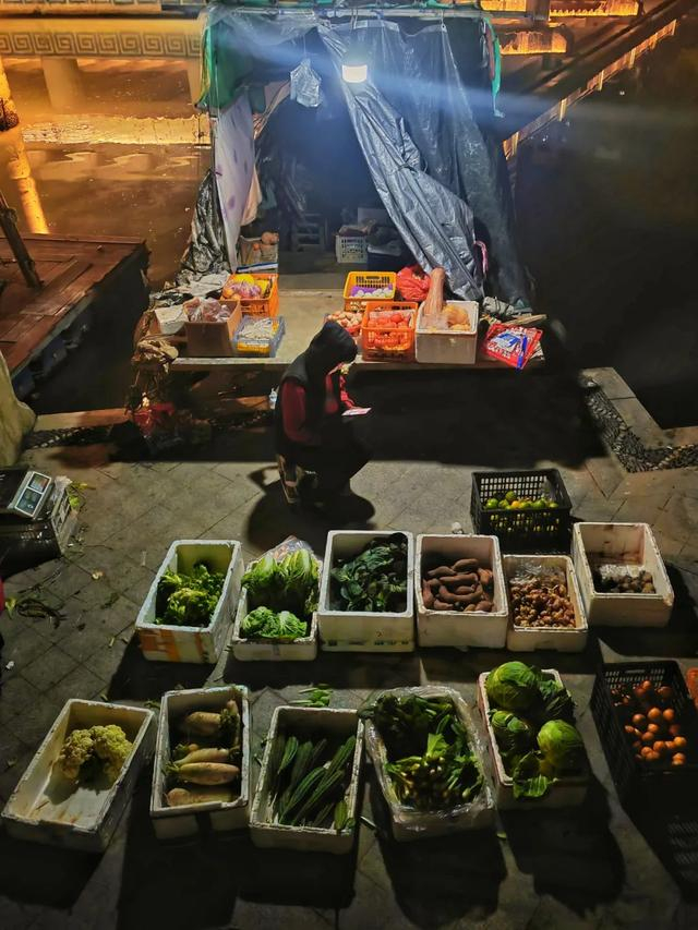 点评:这张照片以俯视视角展现了一个夜间菜摊的场景,有生活气息。摊位上方的灯光照亮了蔬菜与摊主,与周围的昏暗形成反差,突出了主体,营造出一种温暖而又略带神秘的氛围。各类蔬菜摆放整齐,色彩相互交织,有一定的视觉张力。