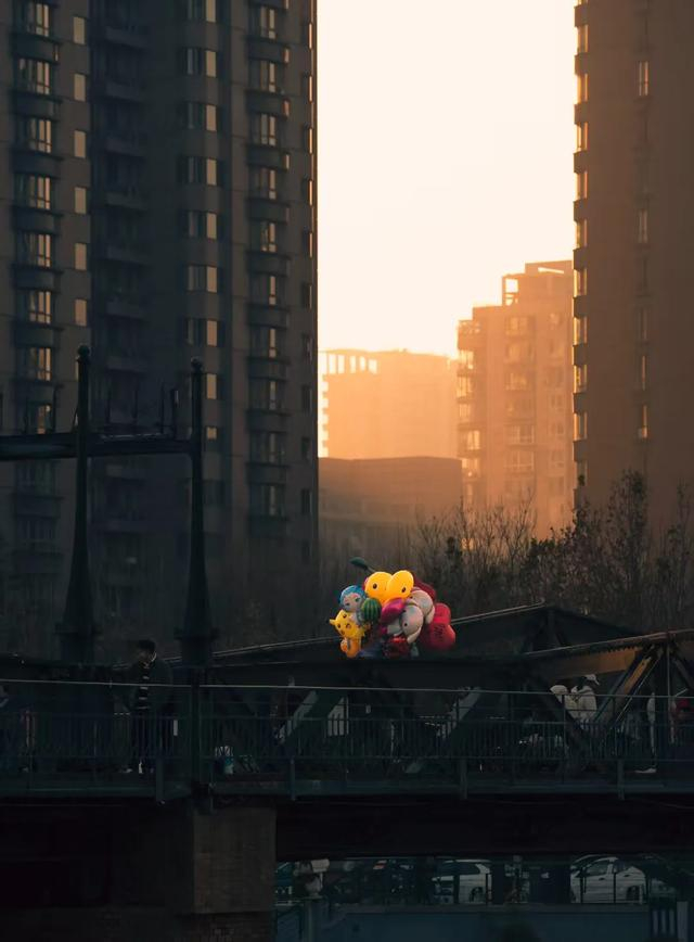 点评:暖色调光线为整个场景披上了一层柔和的薄纱,营造出温暖而宁静的氛围。高耸的居民楼形成天然画框,将视线聚焦于桥上一丛色彩斑斓的气球,气球的多彩与建筑的冷硬形成鲜明对比,画面有活力与趣味性。