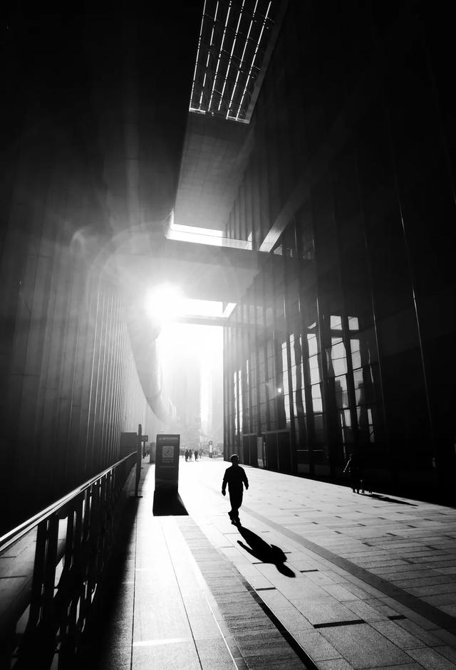人物的剪影成为画面焦点,独自行走在宽阔的步道上,身影拉长,尽显孤独与坚毅。现代建筑的线条硬朗且规整,与人物的柔韧形成对比,凸显出个体在都市环境中的渺小与无畏。极简的黑白色调和精妙的构图,让人不禁思考个体与城市、光明的追寻之间的关系。