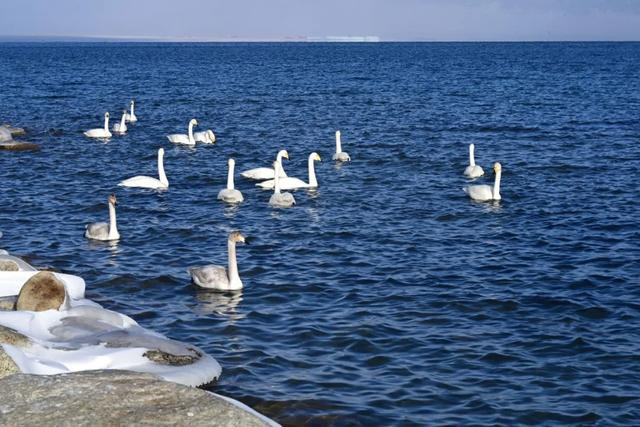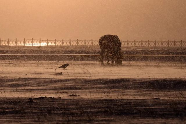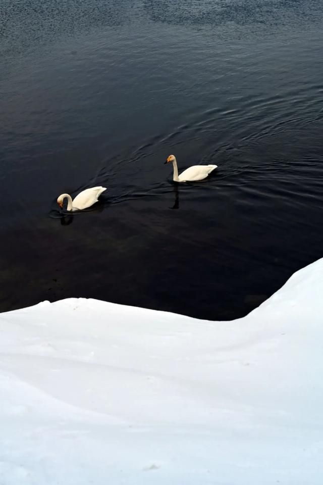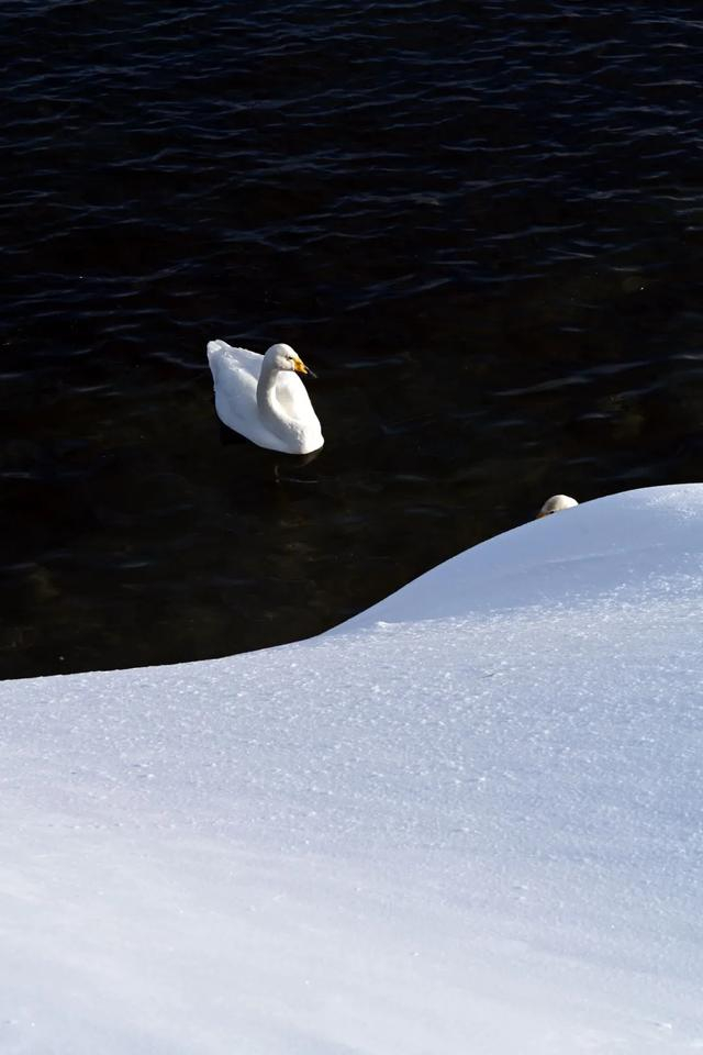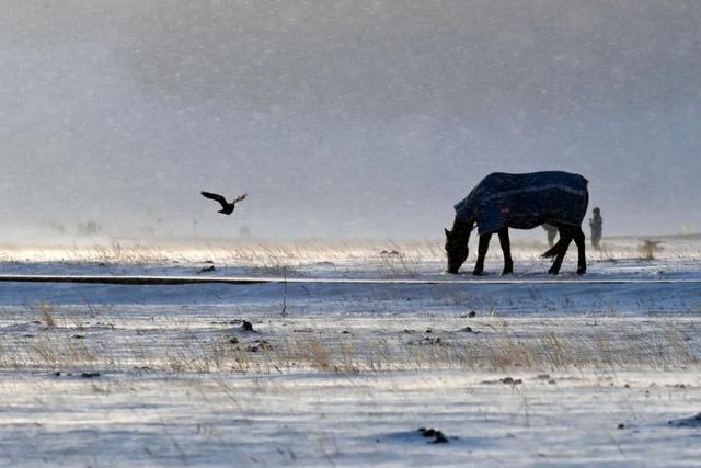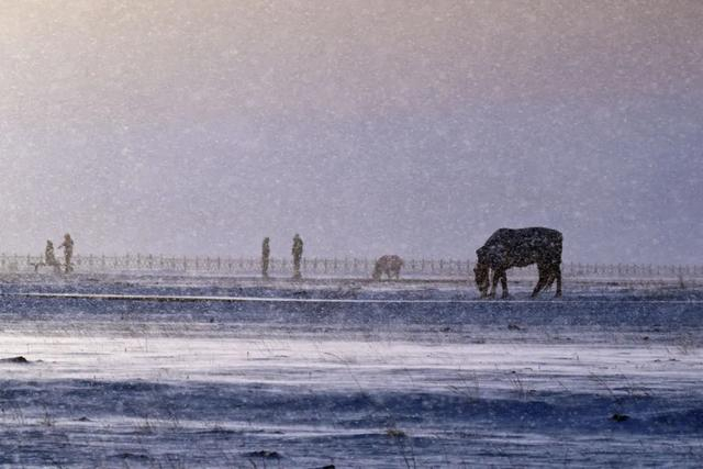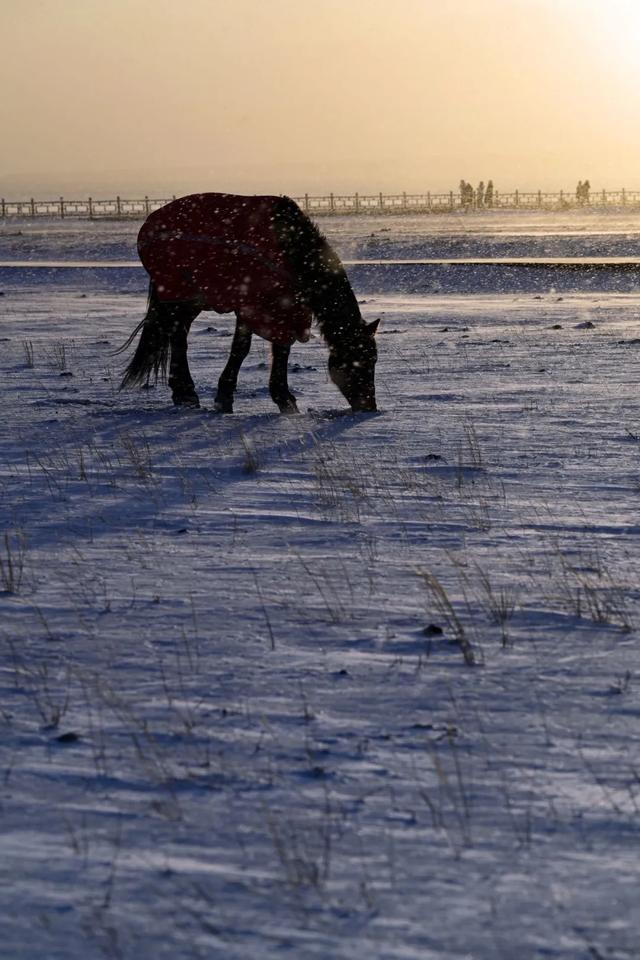 拍了一组马在风吹雪中的画面,感觉像特效,还挺有感觉的。这样天气变化很快,加上赛里木湖很大,东边下雪,西北可能日出。我们到下一个点,天鹅湖的位置,天已晴了。