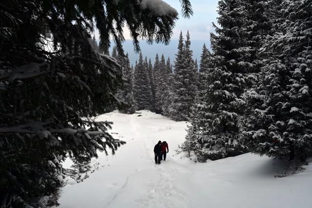 上山的路基本被雪覆盖了,越往山上走雪越厚,天气也是时好是坏,一会儿有光线,一会儿阴云密布。在爬山的途中一直在纠结要不要上山顶。
