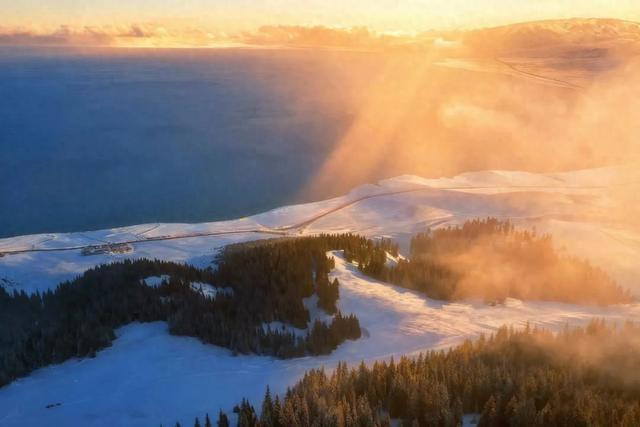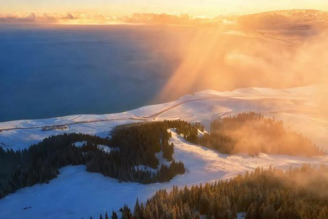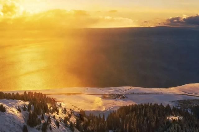 尽管没赶上日出,但山顶上的风景也是很美。站在山顶一览众山小,这种感觉非常好,特别是这样的雪景下的赛里木湖,是第一次看到这么美的风景,感觉这次冒险是值了。