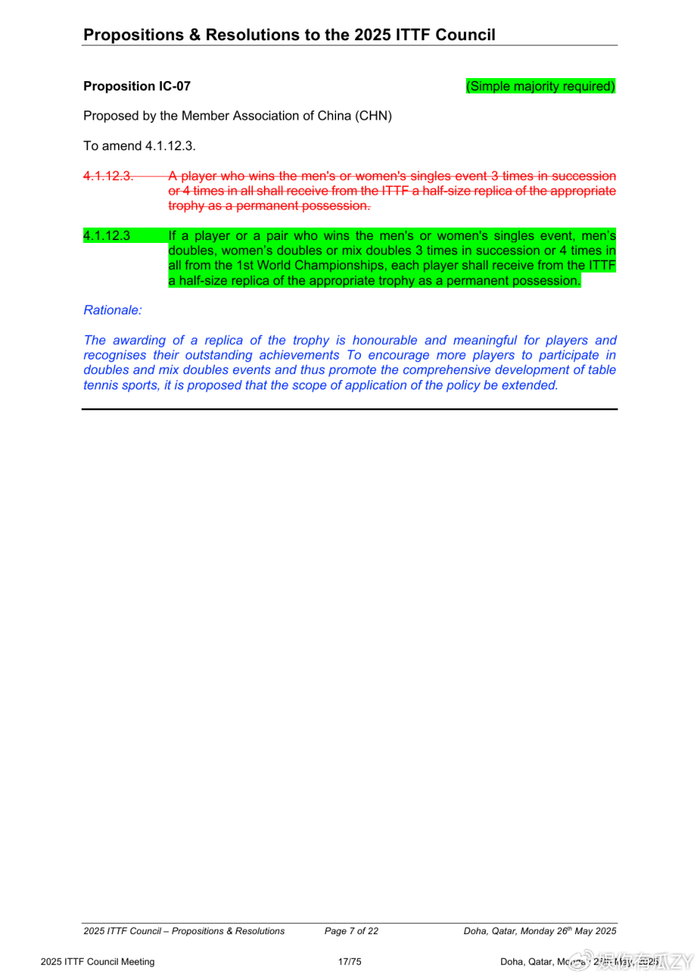 而根据国际乒联理事会发布的最新文件中表明,从首届世乒赛开始,球员如果能在男双、女双和混双项目中达成3连冠或累计4次以上夺冠,同样也可以拿到“复刻杯”。
