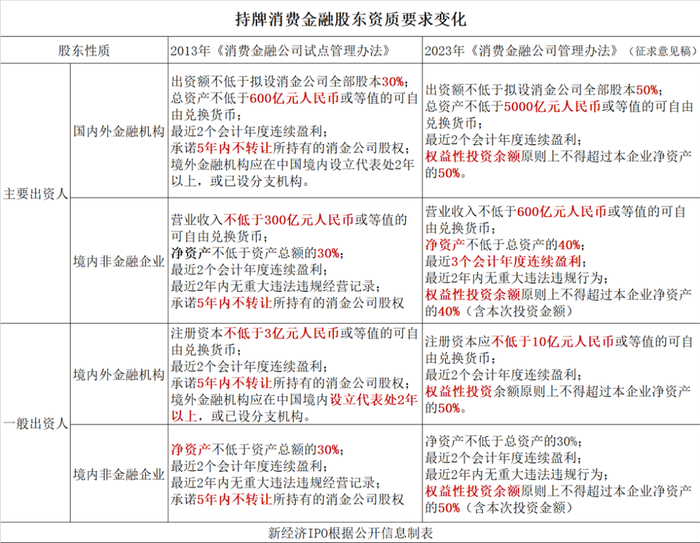 此次“征求意见稿”大幅提高了持牌消金公司的股东准入门槛。意见稿将持牌消金的出资人分为两类:主要出资人和一般出资人;其中,主要出资人为不低于拟设消费金融公司全部股本50%的出资人,主要出资人可以是境内外金融机构,也可以是主营业务为提供适合消费贷款业务产品的境内非金融企业。就金融机构而言,主要门槛是最近1个会计年度末总资产不低于5000亿元人民币或等值的可自由兑换货币;最近2个会计年度连续盈利;就非金融企业出资人而言,入门门槛是最近1个会计年度营业收入不低于600亿元人民币或等值的可自由兑换货币;最近3个会计年度连续盈利。