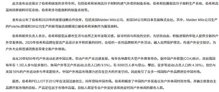 清流工作室梳理得知,伯希和早期或还曾以法国高端户外品牌形象示人。如在《法国户外品牌PELLIOT携20家分销商上线巨益OMS》、《“为冒险而生” 伯希和2020秋冬户外新品发布》等稿件中,便提及公司是于2012年在法国注册创立。