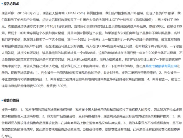此外,清流工作室注意到,伯希和也曾因对品牌背景虚假宣传被起诉。在2017年公布的一则判决书中提到,原告(消费者)称于天猫商城购买了伯希和品牌的户外软壳衣,该商品被宣传为“法国高端户外品牌”,但其产地却是北京;