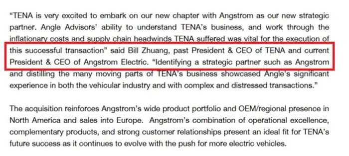 此外,根据公开新闻报道,天海电子子公司TENA2018年聘请华裔Bill Zhuang担任公司总裁兼CEO,在TENA被剥离出售后,Bill Zhuang一直担任该公司的总裁和CEO职务。