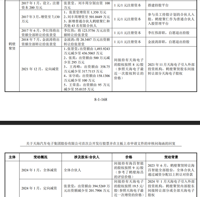 招股书显示,天海汽车电子通过员工持股平台鹤壁聚仁(后分立为鹤壁聚海)、鹤壁聚贤、鹤壁聚科、鹤壁聚力、鹤壁聚智、鹤壁聚杰实施股权激励。其中,鹤壁聚贤成立于2017年1月,主要合伙人为刘丰周、兰军、周萍、孙新普等,其中,刘丰周和兰军在合伙企业中的出资比例分别为10.5235%和9.5353%。