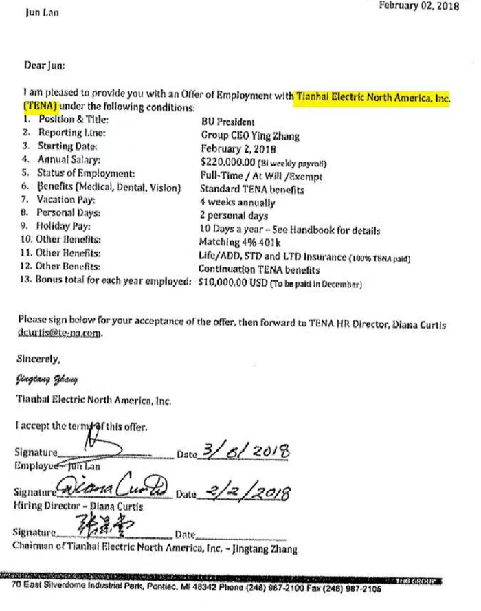 新经济IPO注意到,兰军2009年-2019年担任天海电子海外业务负责人,也是天海曾经的海外子公司TENA的主要负责人。2018年2月,鹤壁天海环球电器有限公司曾与兰军签署过聘用合同,任命后者担任天海汽车电子国际业务系统总经理,基础年薪为22万美元,任职至2021年1月,工作地点位于河南鹤壁和美国底特律。