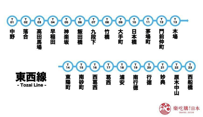看到东西线的名称,大概就不难想象它是贯穿了东西向的电车路线。东西线代表颜色为天蓝色,路线记号为「T」,它的路线总长30.8公里,为9条路线中最长。东西线连结起东京都的中野站至千叶县的西船桥站,也成为千叶县民重要的通勤交通方式,亦为东京Metro系统中载客量最高的路线。除了上述提到的中野、西船桥之外,路线上还包括充满法式风情的神乐坂、台湾「诚品生活」进驻的COREDO室町TERRACE日本桥等车站,都能能轻巧感受到东京不同的面貌与魅力。