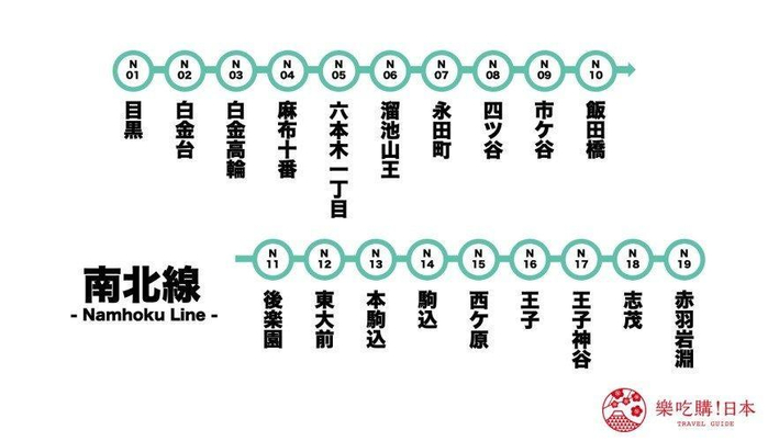 行经于东京都品川区的目黑站与北区的赤羽岩渊站之间的南北线,其实是平成时代的1991年才开通的年轻电车路线,全线总长21.3公里,行经19座车站。相较於稍早介绍到的东西线,南北线的行经方向贯穿了东京都的南北向,沿线有许多庭园景致的代表性景点,如西ヶ原站附近的旧古河庭园、驹込站附近的赏樱名所六义园等,目黑、白金高轮等高级住宅区也在这里,代表色选为翠绿色,路线记号为「N」。