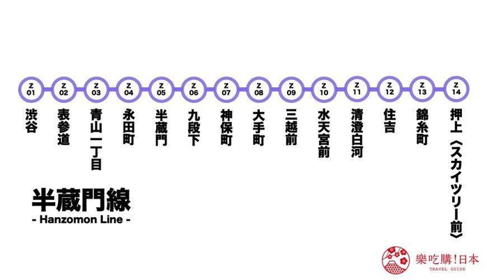 半藏门线行经於年轻人时尚圣地的涩谷站,以及东京晴空塔所在的押上站之间,共有14站,路线总长16.8公里,且全线都位於地底。它的名字充满江户风情,其实命名来源就是出自於江户幕府一代将军德川家康的家臣「服部半藏正成」,他的住处旁正好是江户城的其中一道城门「半藏门」,由於旧址即位於路线上,就以此为名了。半藏门线的路线记号为「Z」,代表色为紫色,恰巧又可以和江户时代流行的色彩「江户紫」做连结,是一条有着历史缘由的电车路线。半藏门线同时也经过许多充满特色的车站,如清澄白河、青山一丁目等,都是日本年轻人相当喜爱的散步购物好去处。