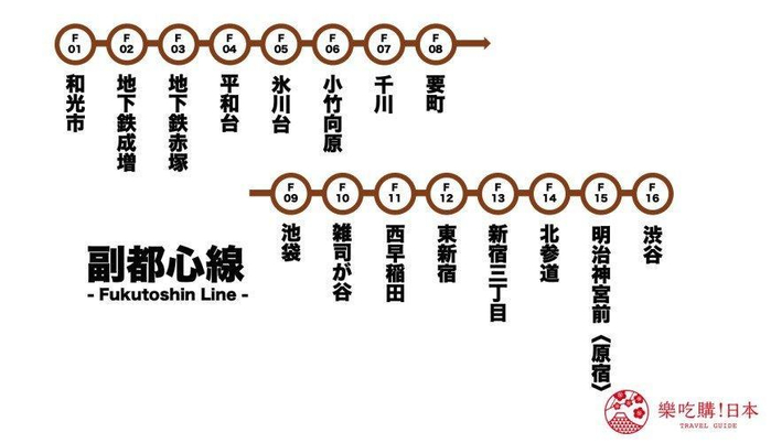 副都心线是东京Metro当中最年轻的路线,它在2008年时开通,行经16站,路线总长20.2公里。副都心线连结起池袋、新宿、涩谷3大东京「副都心」,再加上副都心线又与东武铁道、西武铁道、东急电铁与横滨高速铁道互相直通运行,让埼玉县、东京都、神奈川县得以连成一线,营造出便利的广域铁路网。副都心线的路线记号为「F」,代表色为棕色。